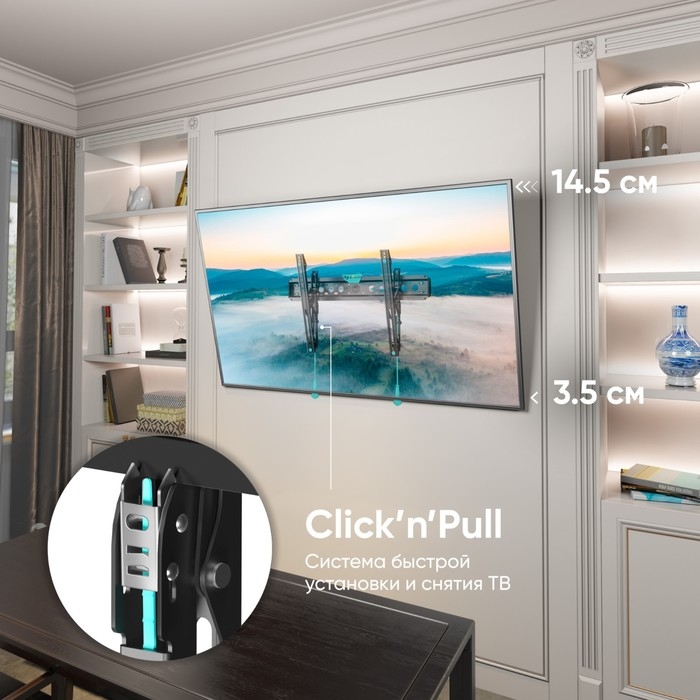 Широкий выбор вариантов монтажных отверстий для установки на стену позволяет надежно зафиксировать кронштейн даже при креплении к не самым прочным поверхностям. Тонкий профиль (от 3,5 до 14,5 см) сделает кронштейн почти незаметным за Вашей ТВ-панелью, что добавит эстетичности образу Вашего устройства. Изделие выполнено из холоднокатаной стали высочайшего качества, что обеспечивает не только его прочность и долговечность, но и премиальный внешний вид.