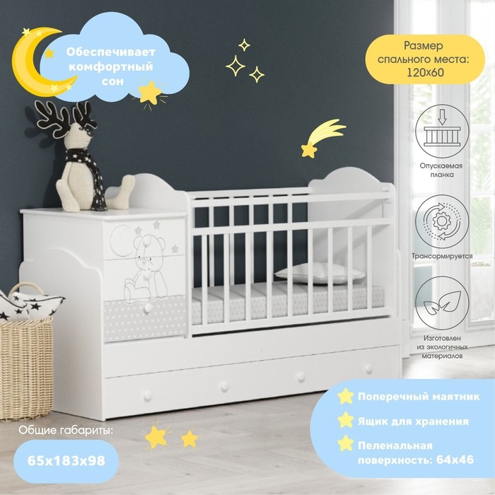 Когда Ваш малыш подрастет Вы можете трансформировать кроватку в подростковую со спальным местом 170х60 и отдельно стоящую тумбу.
