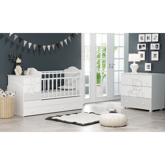 Кровать укомплектована комодом с тремя вместительными ящиками на роликовых направляющих, куда с легкостью поместится все не обходимое для ежедневного ухода за Вашим малышом.