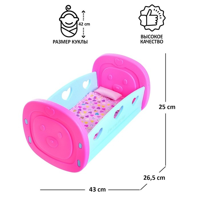 Размер кроватки: 43 × 26 × 25 см. Она не подходит для кукольного домика. Размер спального места: 38 × 19,5 см. Дно выполнено из прочного картона. Кроватка имеет функцию качания.