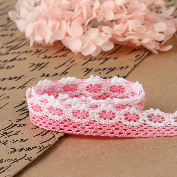 Кружево вязаное, 20 мм × 15 ± 1 м, цвет розовый/белый