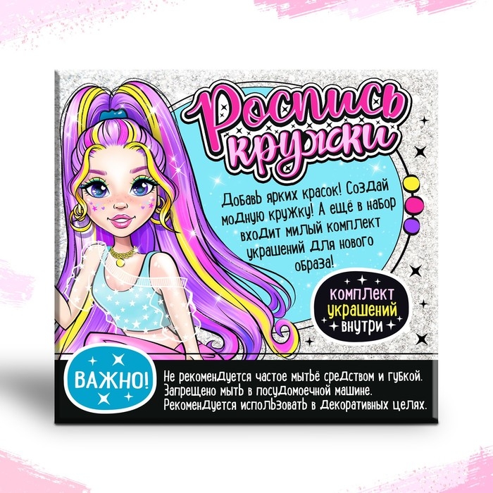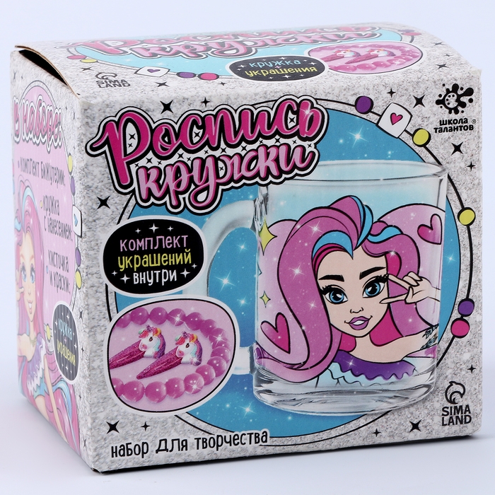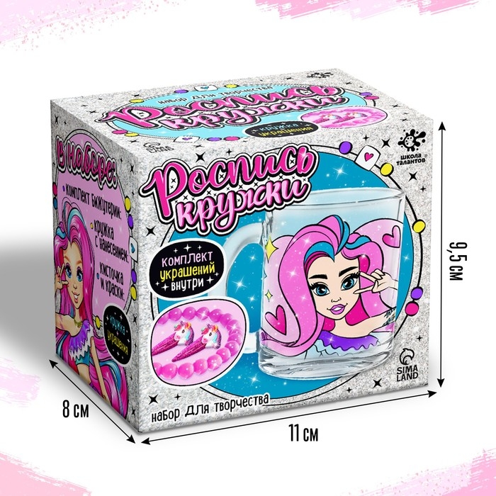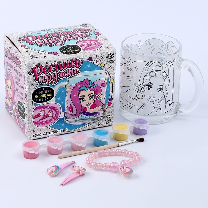 Комплект из кружки, красок и украшений — отличный подарок для любой девчонки! Он поможет малышке развить творческие способности, а браслет и заколки станут приятным дополнением.
