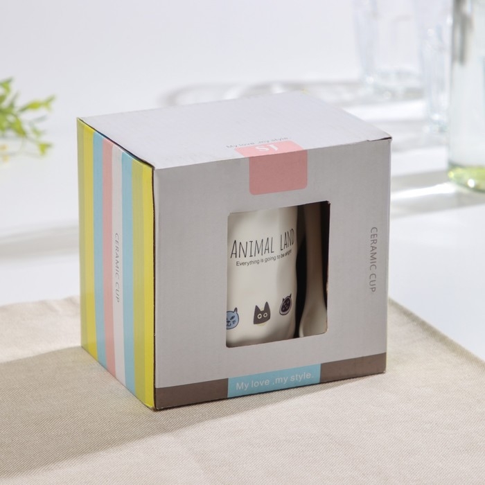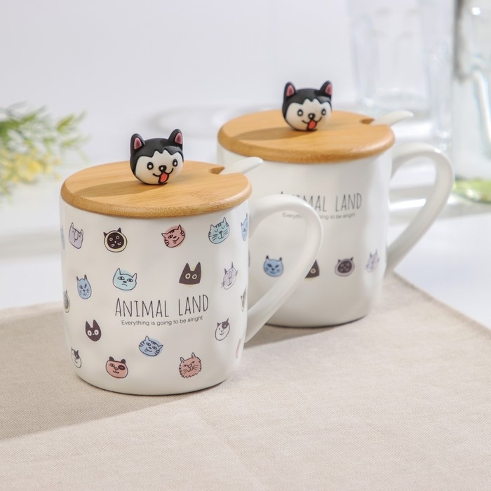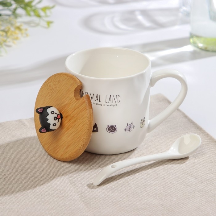Кружка керамическая с деревянной крышкой и ложкой «Зверята», 360 мл, рисунок МИКС