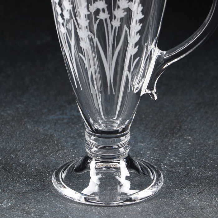 Главным украшением кружки является оригинальный дизайн, выполненный в виде нежных цветков лаванды, которые плавно перетекают друг в друга. Их контуры легко и грациозно заворачиваются вокруг кружки, придавая ей особый шарм. Цветы нанесены на стекло технологией гравировки, что дает им устойчивость к повреждениям и сохраняет яркость цвета на долгое время.