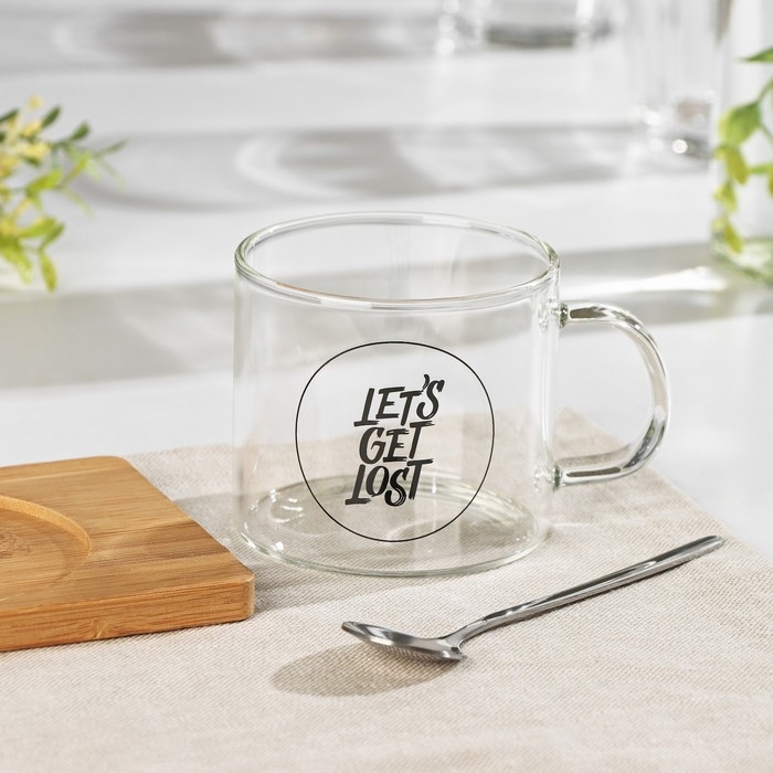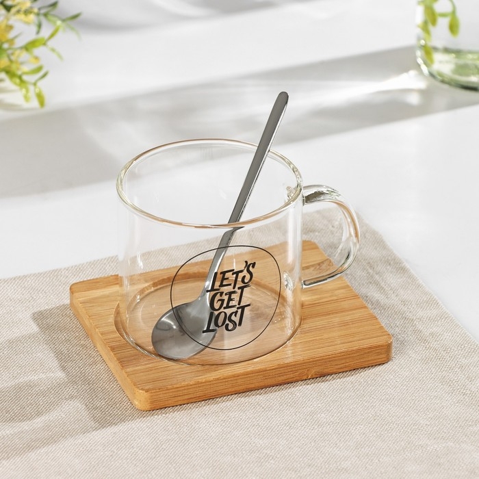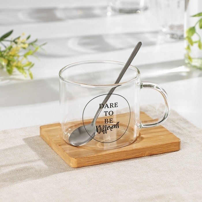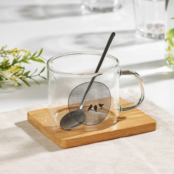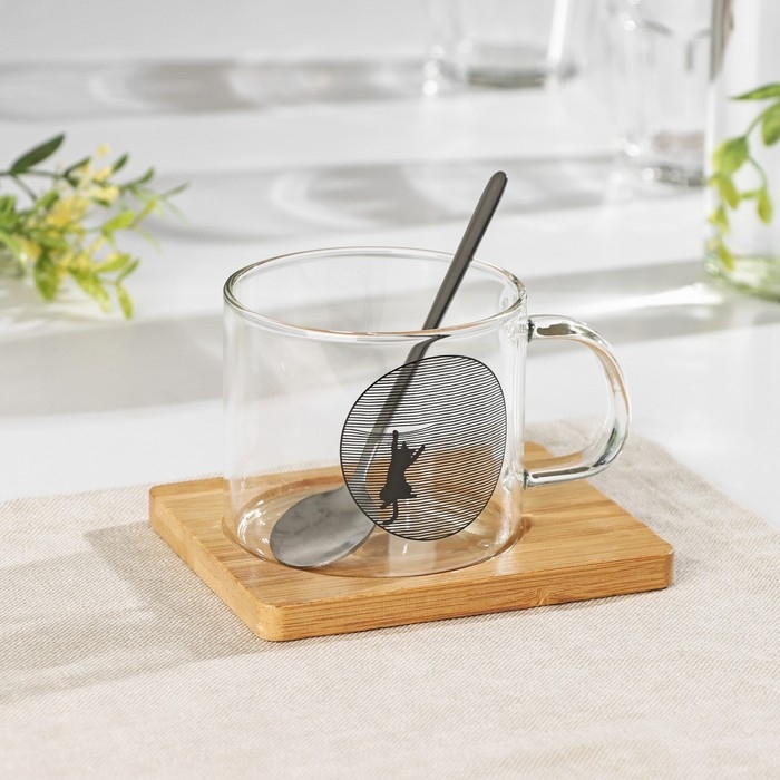 Кружка стеклянная с ложкой на деревянной подставке «Котик», 300 мл, рисунок МИКС
