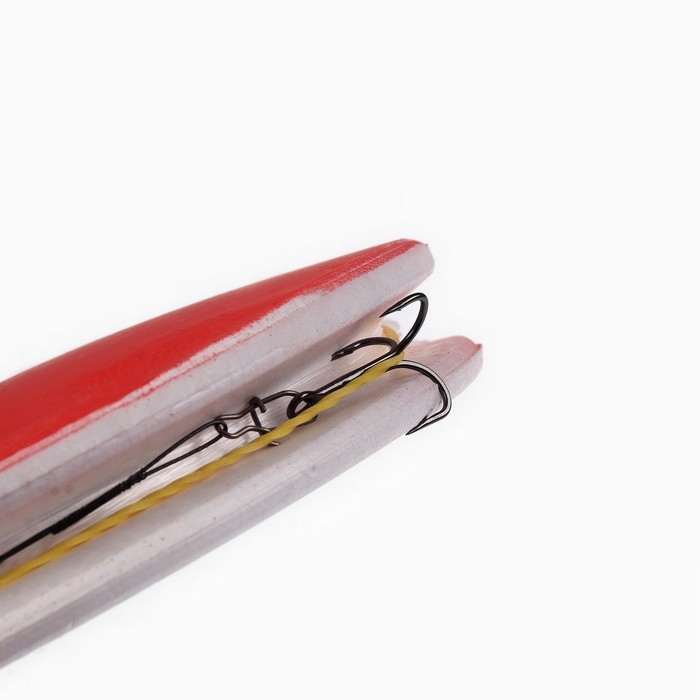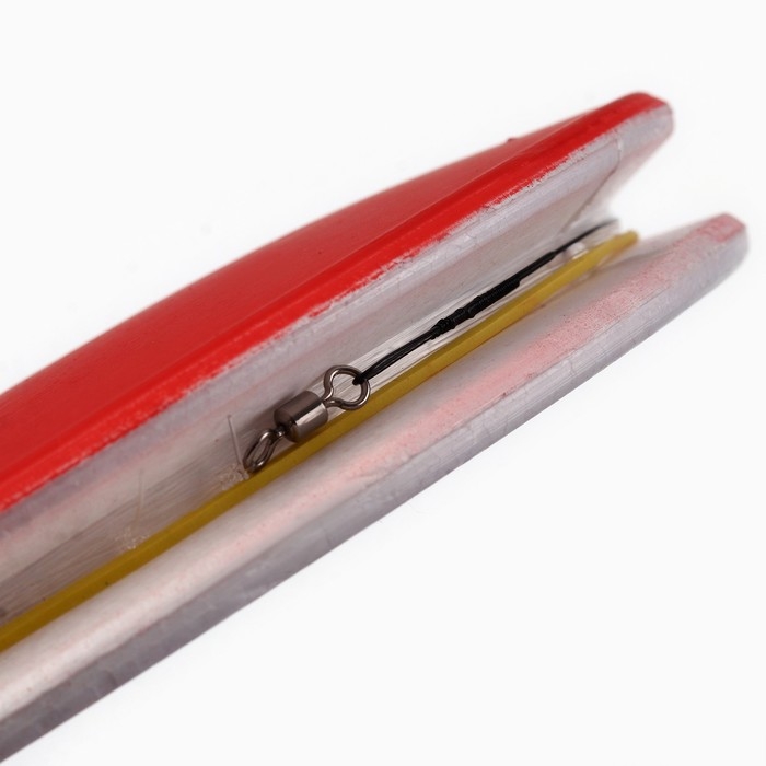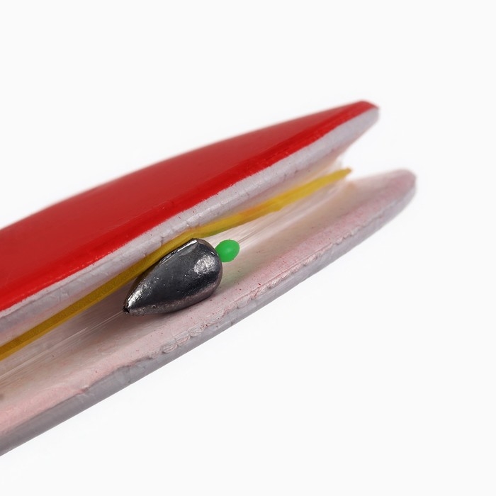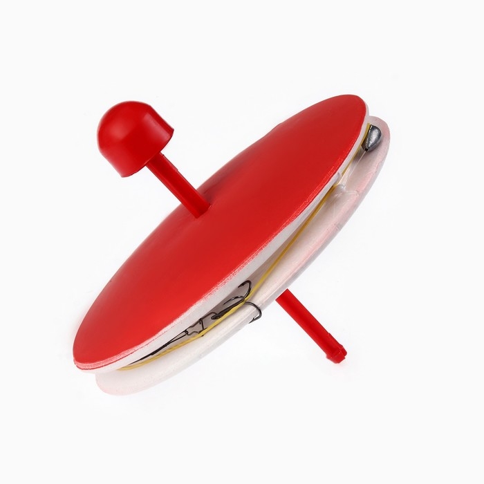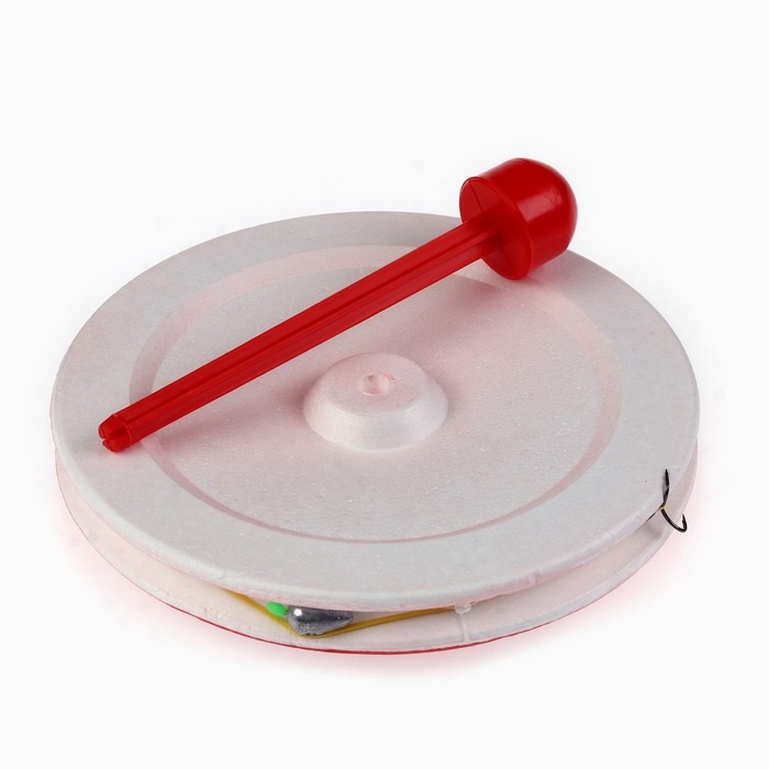 Кружок изготовлен из прочного прессованного пенопласта. Для заметности верхняя часть кружка окрашена в красный цвет. В центре предусмотрено отверстие под снимаемый пластиковый штырь. По периметру кружка расположен желобок, который служит для укладки лески.