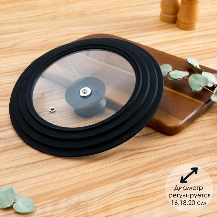 Крышка для сковороды и кастрюли Доляна стеклянная, универсальная, с силиконовым ободком и ручкой, d=16/18/20 см, цвет чёрный