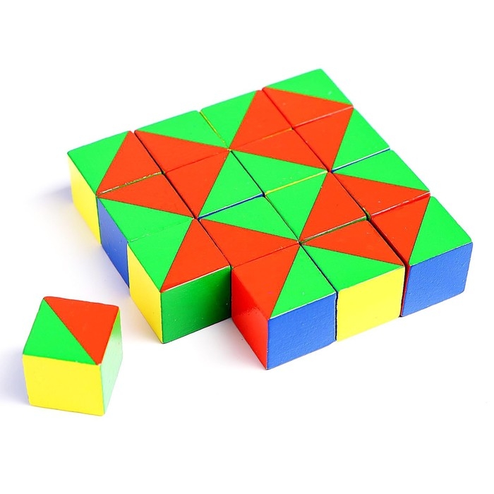 Игра состоит из 16 одинаковых кубиков. Каждая из шести граней окрашена по-своему. Это позволяет составлять множество узоров.