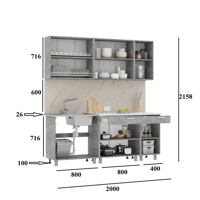 Кухонная мойка, стеновая панель, решётка для посудосушителя, приобретаются отдельно.