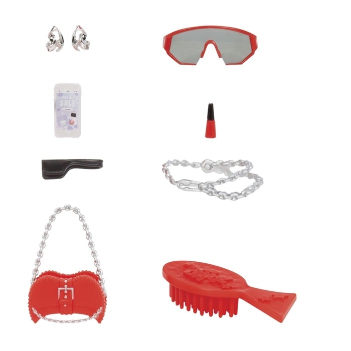 - В наборе: комплект одежды, пара обуви со съёмными ногами, очки, серёжки, цепочка для ремня, сумочка, телефон, помада, утюжок, фен, расчёска, постер.