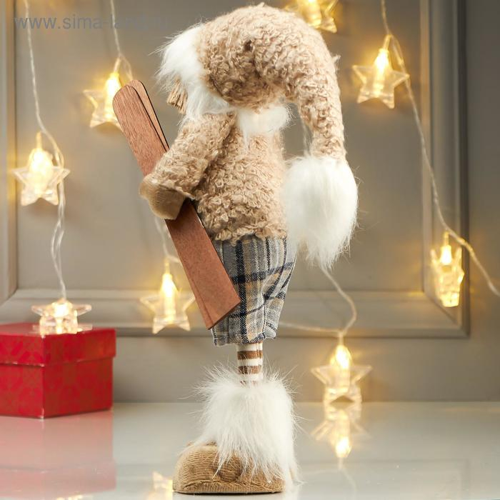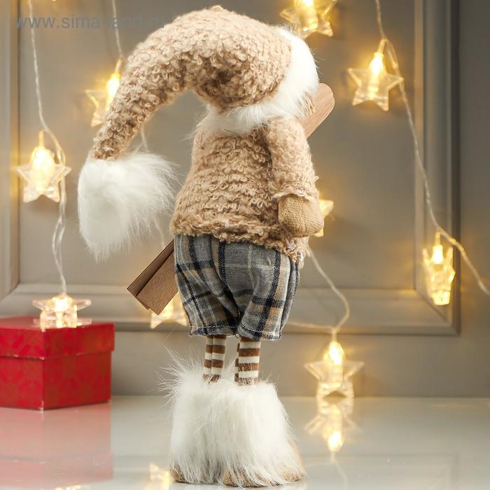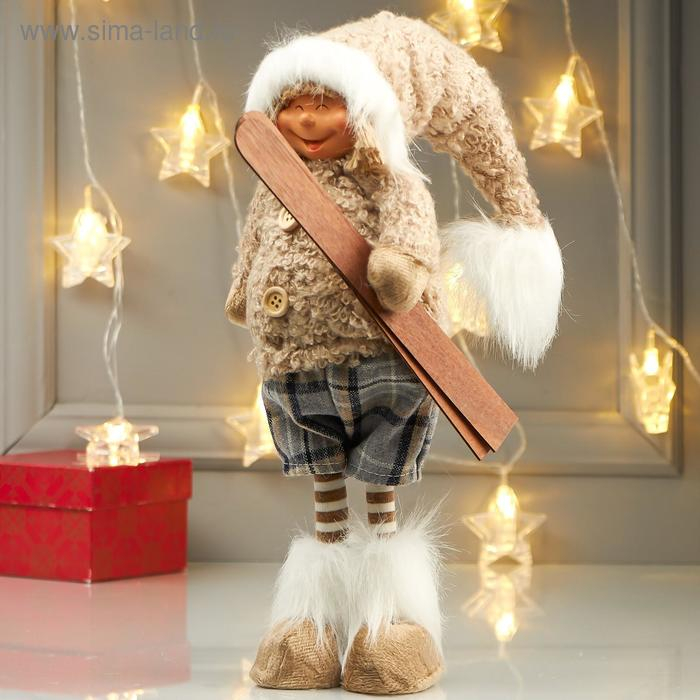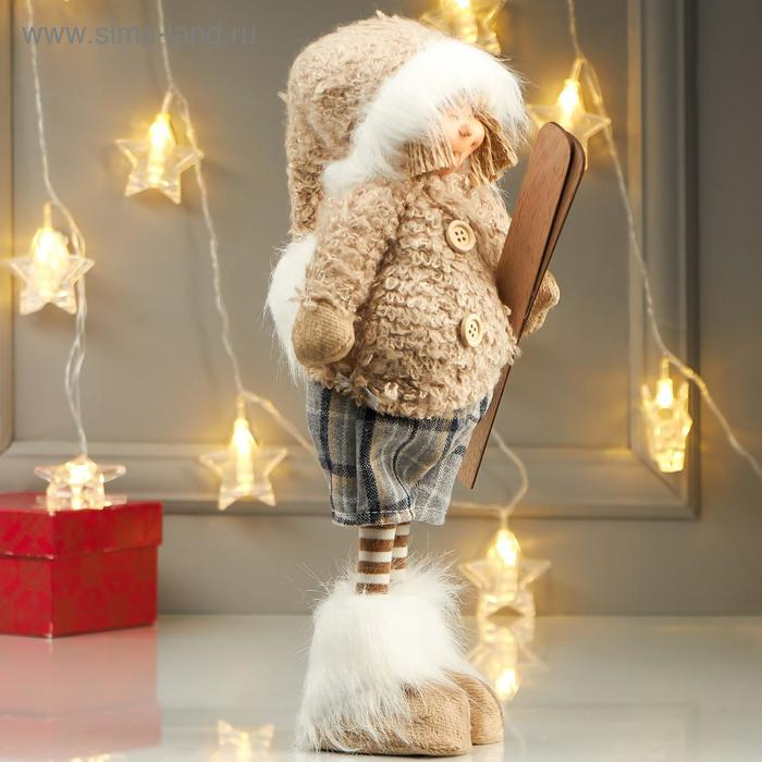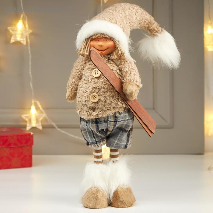 Кукла интерьерная "Мальчик в бежевой меховой куртке, с лыжами в руке" 47х12х15