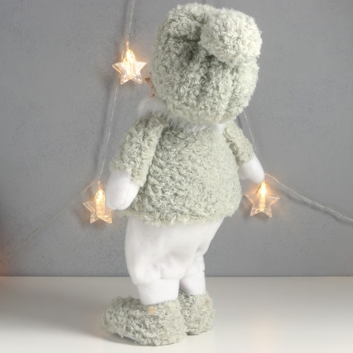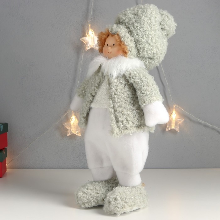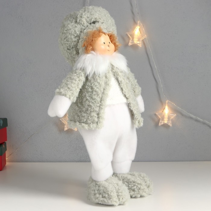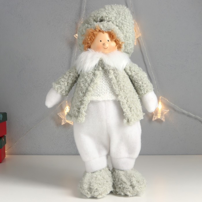 Кукла интерьерная "Мальчишка-пухляш в шапке с бомбошкой, зимний наряд" 40х22х13 см