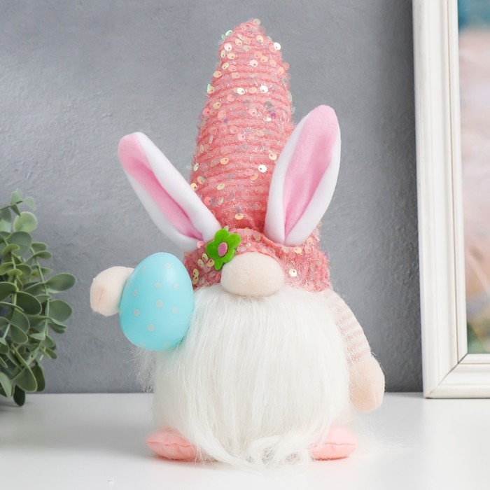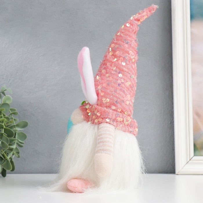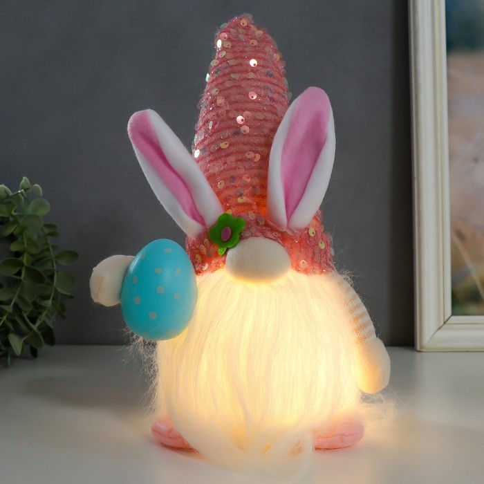 Кукла интерьерная свет "Гном в колпаке с зайчьими ушами, пайетки" розовый 30х8х8 см