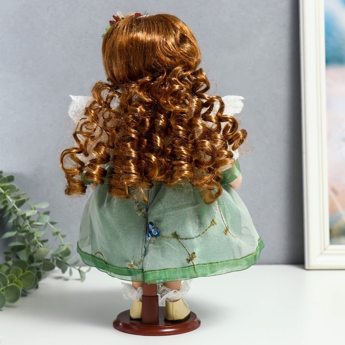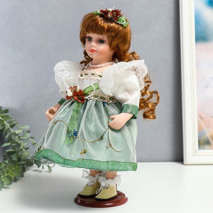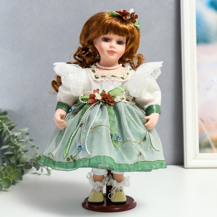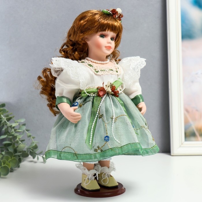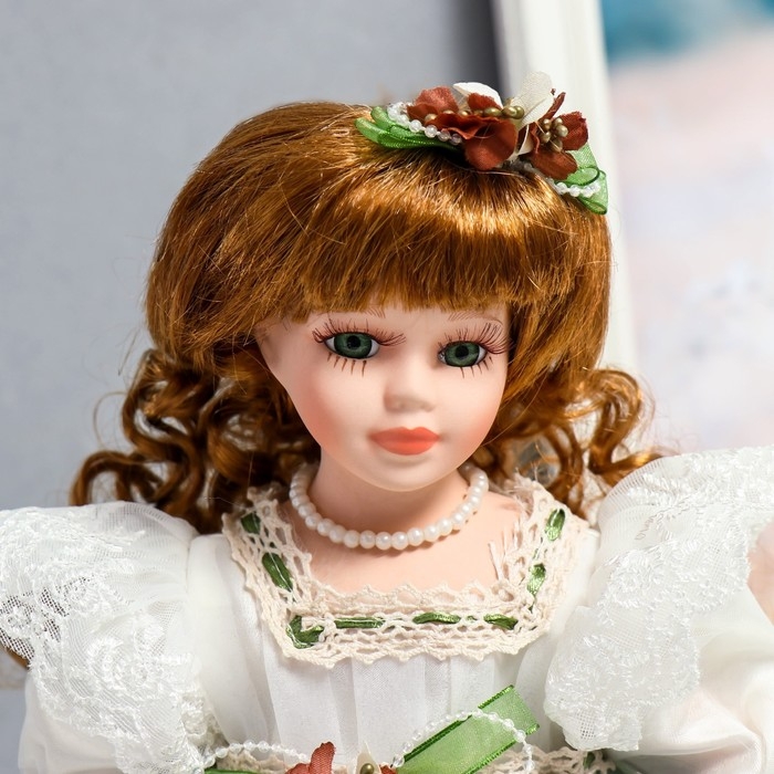 Кукла коллекционная керамика "Агата в бело-зелёном платье и с цветами в волосах" 30 см
