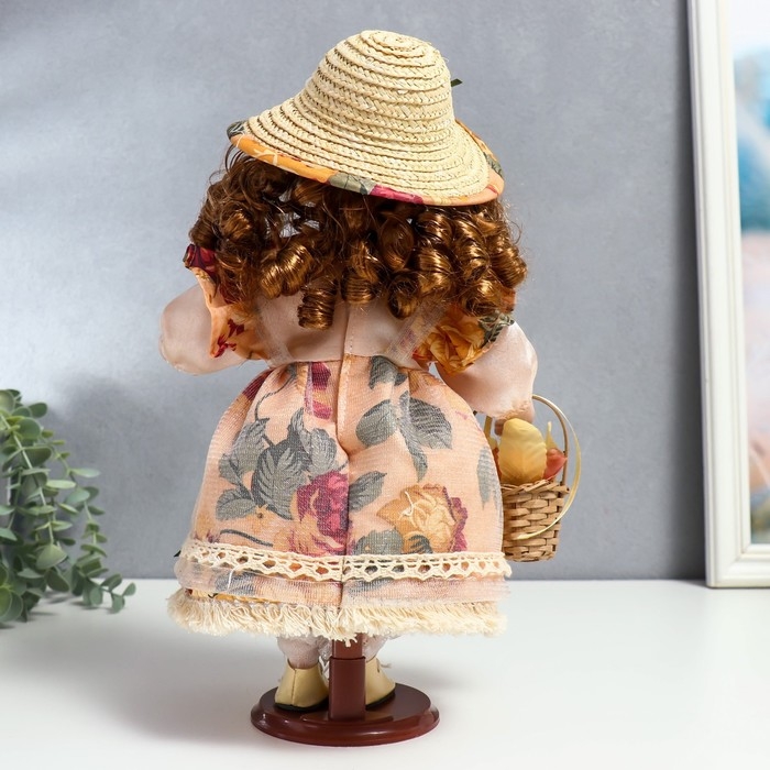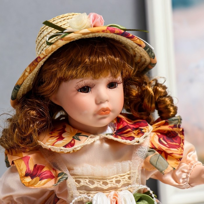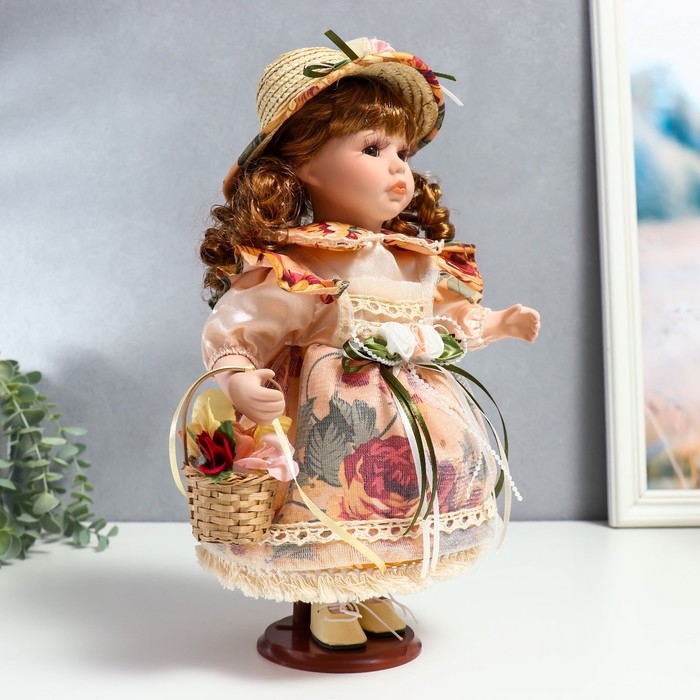 Кукла коллекционная керамика "Клара в платье с розами, шляпке и с корзинкой" 30 см