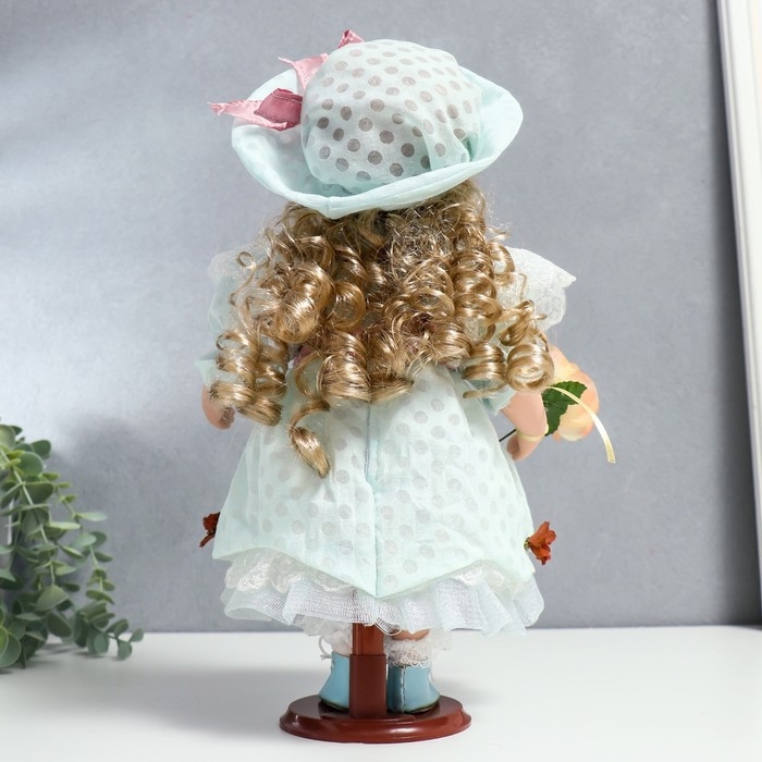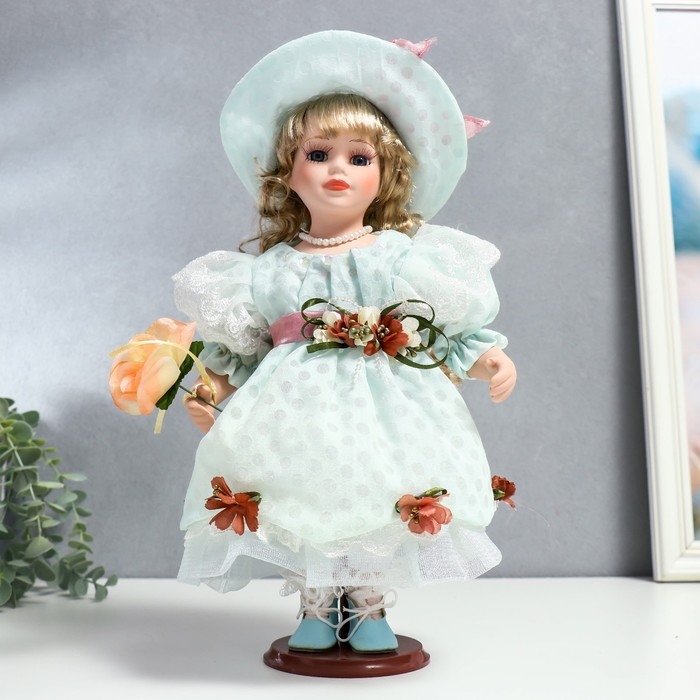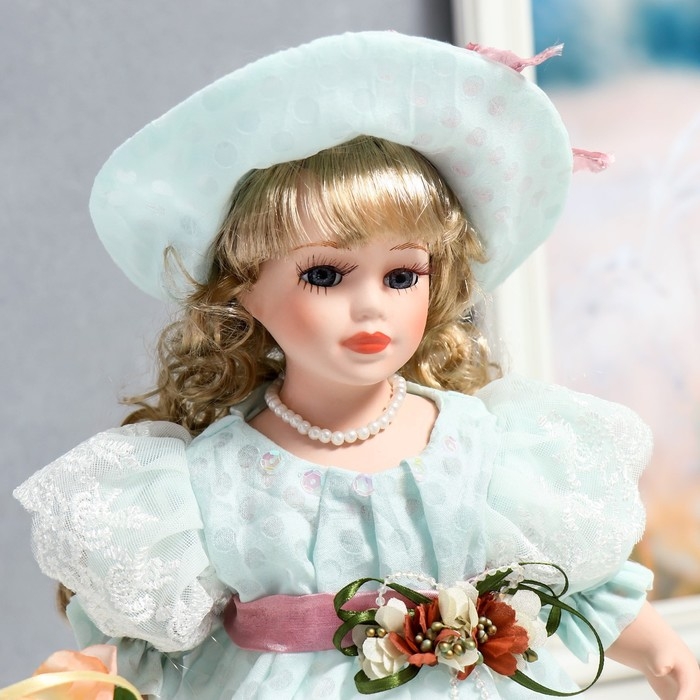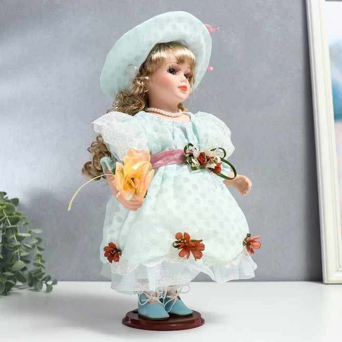 Кукла коллекционная керамика "Люси в голубом платье, шляпке и с цветами" 30 см