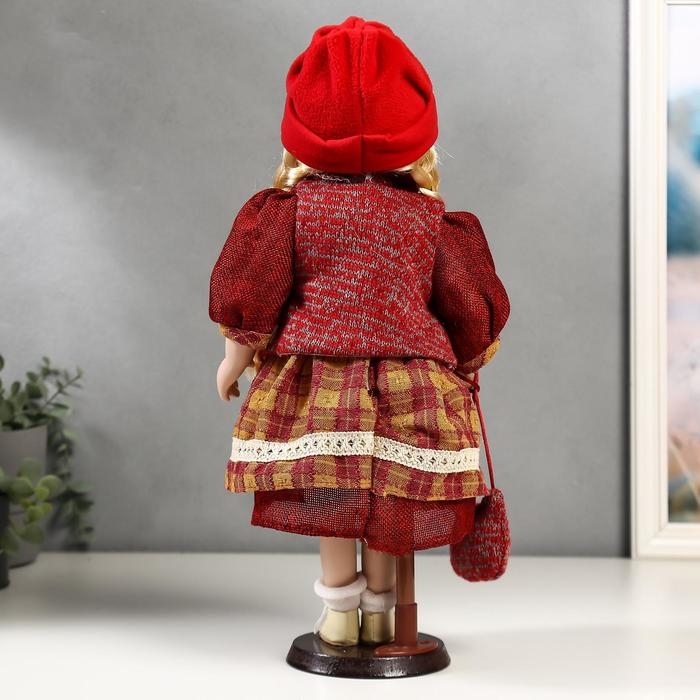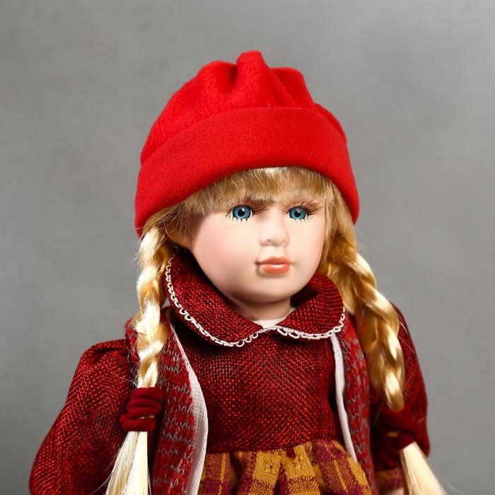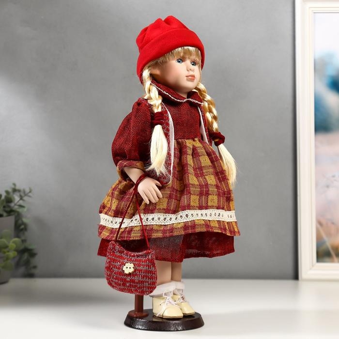 Кукла коллекционная керамика "Марина в бордовом платье в клетку" 40 см