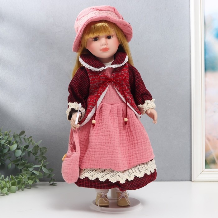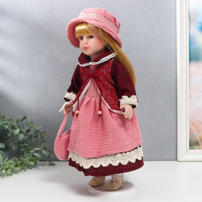Кукла коллекционная керамика "Нина в розовом платье и бордовом жакете" 40 см