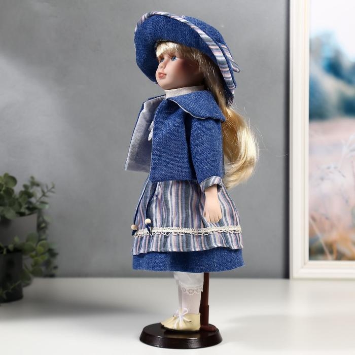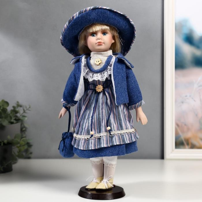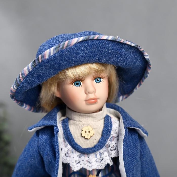 Кукла коллекционная керамика "Стася в синем полосатом платье и синей куртке" 40 см