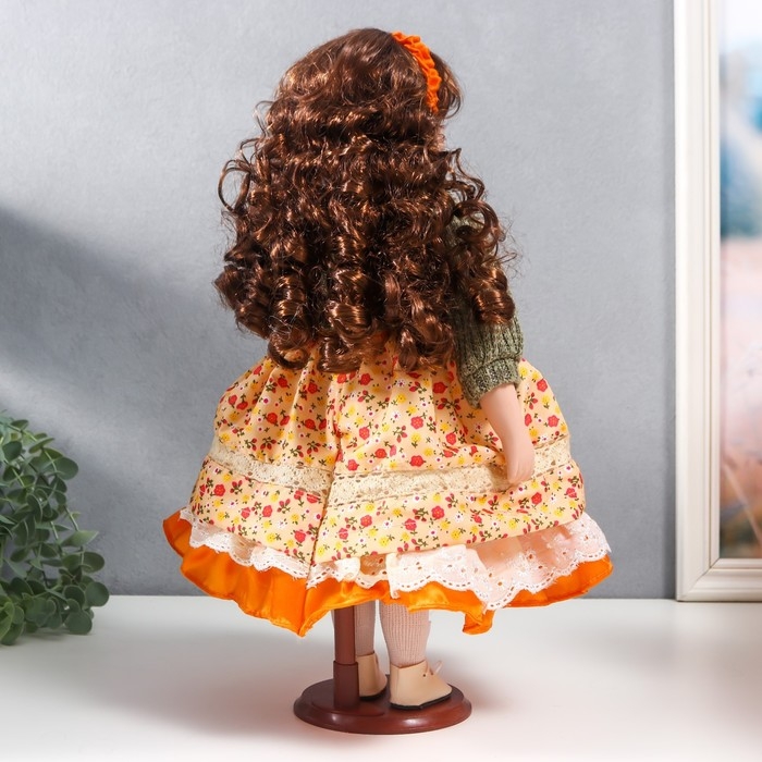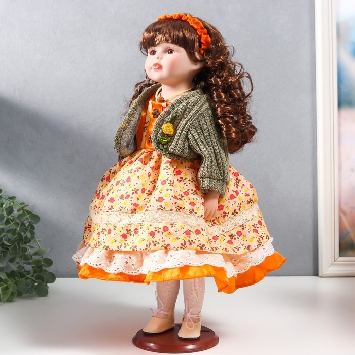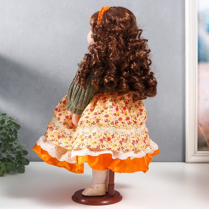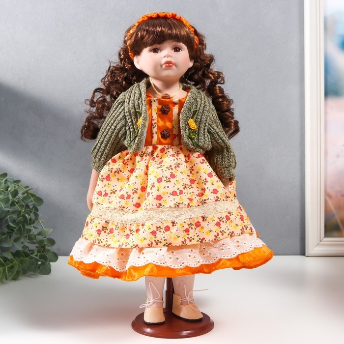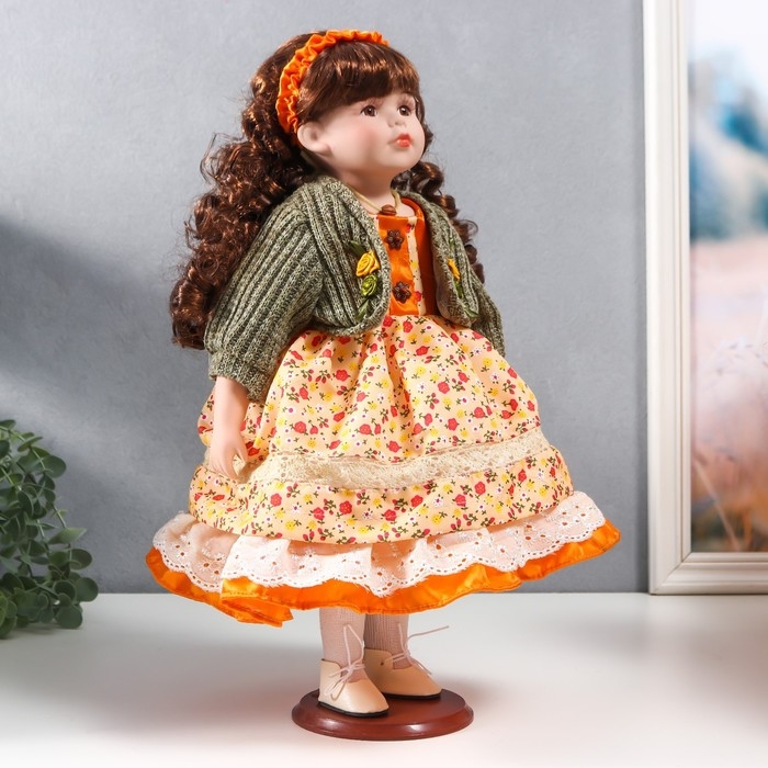 Кукла коллекционная керамика "Вера в платье с мелкими цветами и зелёном джемпере" 40 см