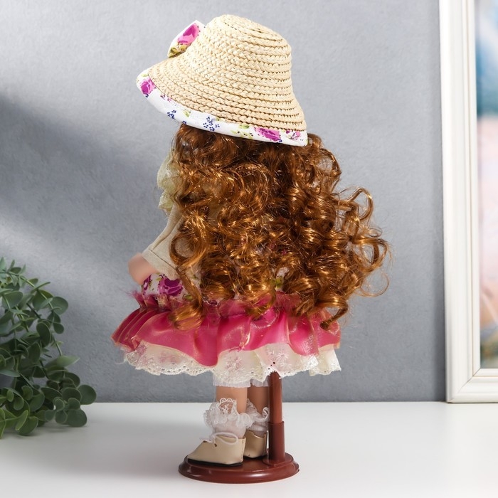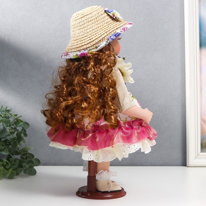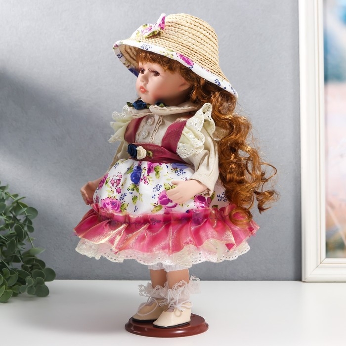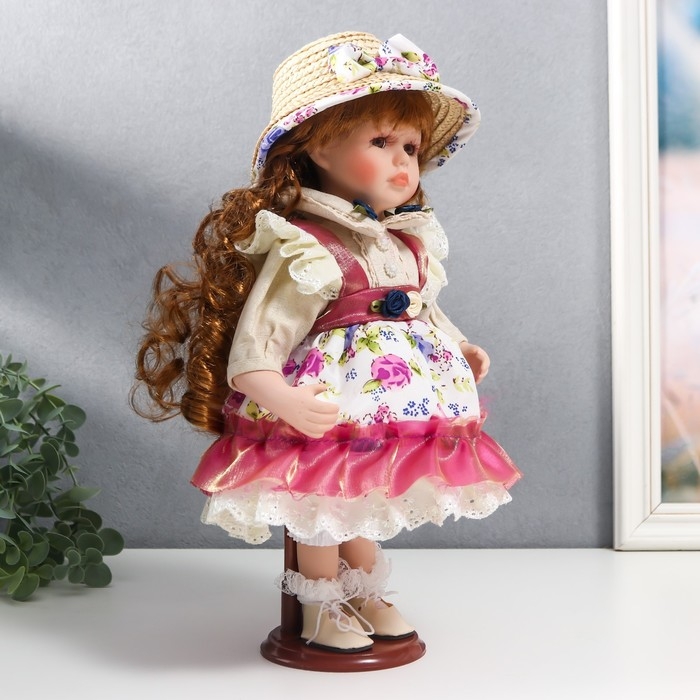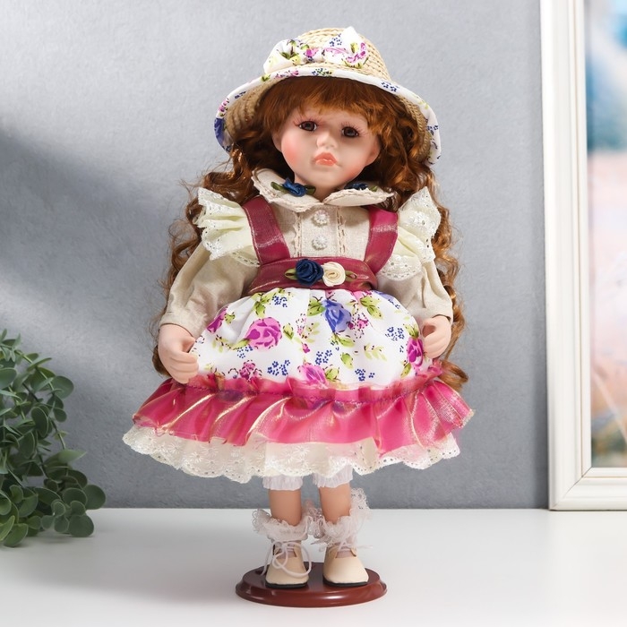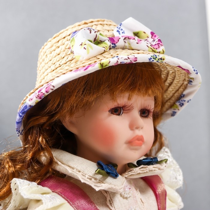 Кукла коллекционная керамика "Женечка в платье с цветами, в соломенной шляпке" 30 см