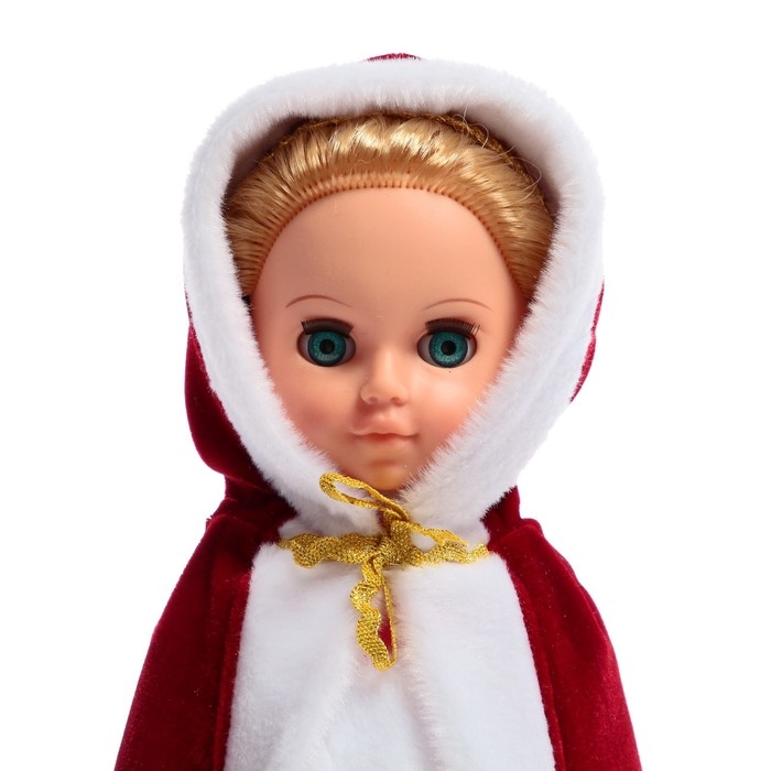 - В комплект одежды входит: платье из шёлка, плащ-накидка с капюшоном из красного бархата, муфта из белого плюшевого меха, трусики. Голову украшает ободок, на ногах туфельки.