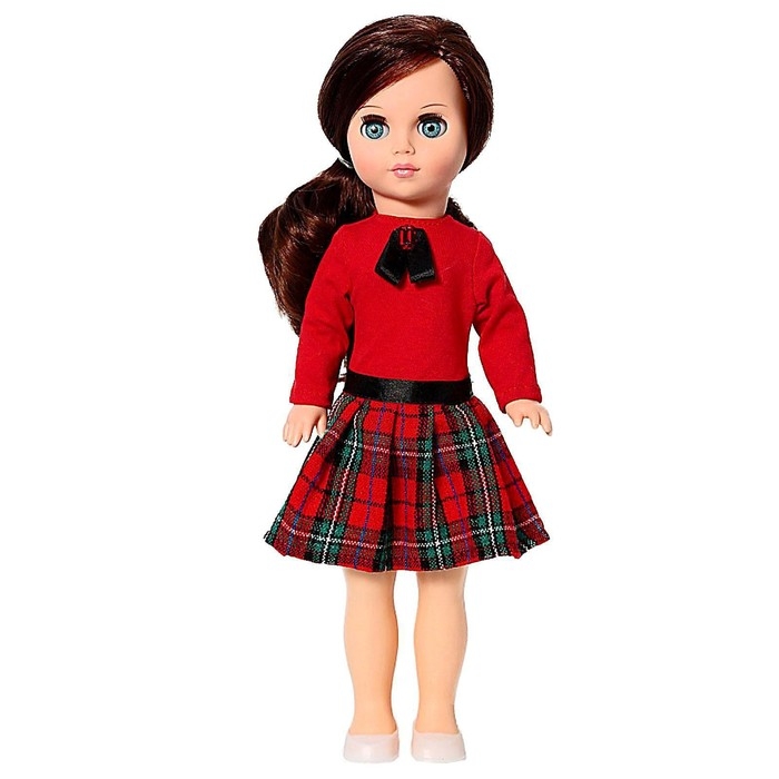 - Кукла одета в модный костюм: платье ткани разных фактур — трикотаж и шотландка. На груди у неё декоративный бант. На ногах белые туфельки. Куклу можно одевать и раздевать.