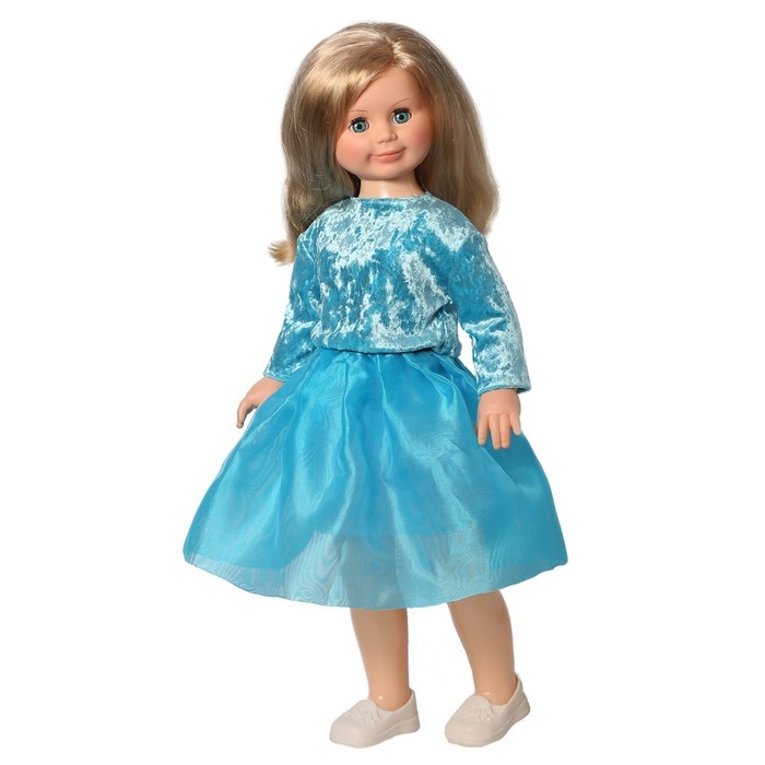 - Кукла одета в голубой свитшот и пышную голубую юбку, а на ногах белые туфли.