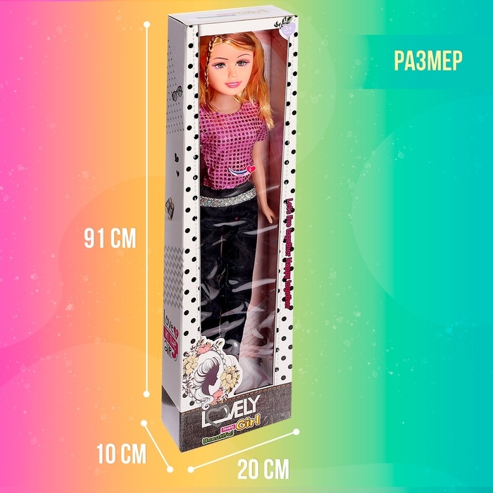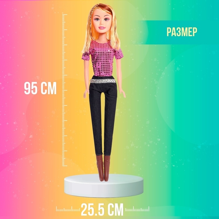 Ростовая кукла станет отличным подарком для любой девочки. Яркий образ, густые волосы и стильная одежда с пайетками не оставят равнодушным ни одного ребенка. Кукла полностью подвижна: одежда и обувь легко снимаются благодаря удобным липучкам, позволяя создавать множество новых образов. Высота куклы 95 см.
