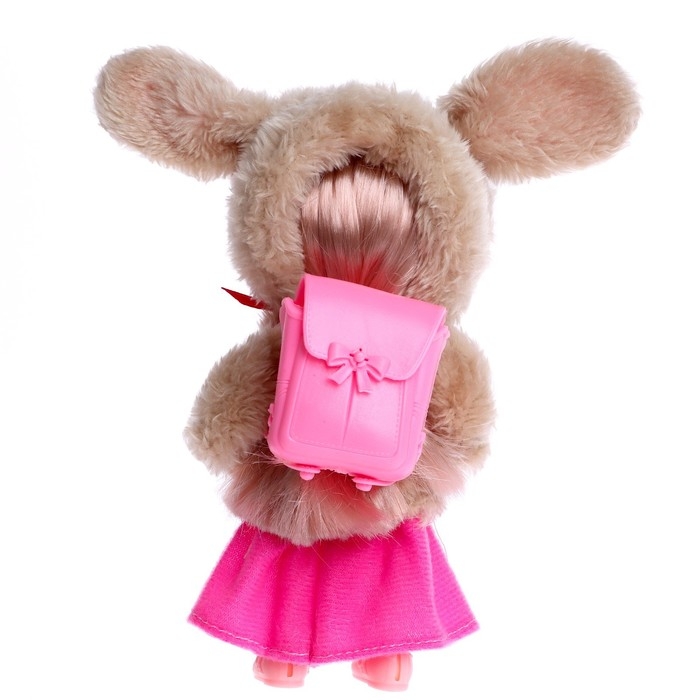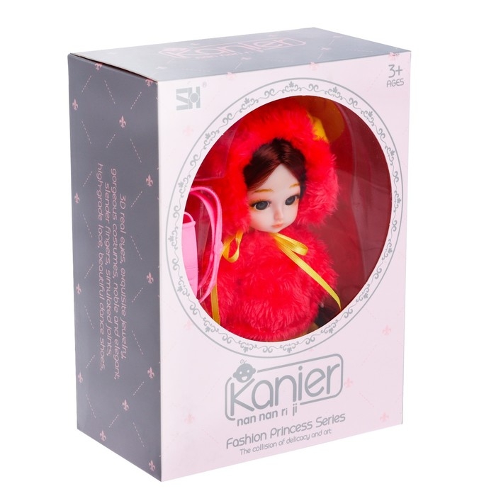 У куколки длинные волосы. Расчешите их и сделайте красивую укладку! Яркое платье, туфельки и портфельчик создают стильный образ. Мягкая шубка снимается.
