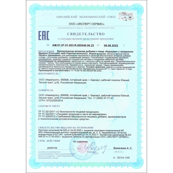 Рекомендуется в качестве биологически активной добавки к пище - источника куркумина, содержащей пиперин. Куркумин с пиперином способствуют поддержке здорового пищеварения, здоровью сердечно-сосудистой системы и поддержке иммунной системы. Помимо укрепления иммунной системы, куркумин обладает широким спектром полезных свойств. Он является сильным природным антиоксидантом. Куркумин препятствует образованию холестериновых камней в печени и желчном пузыре, стимулирует сокращение желчного пузыря и обладает гепатопротекторным действием. Также активно применяется для снижения суставных болей.