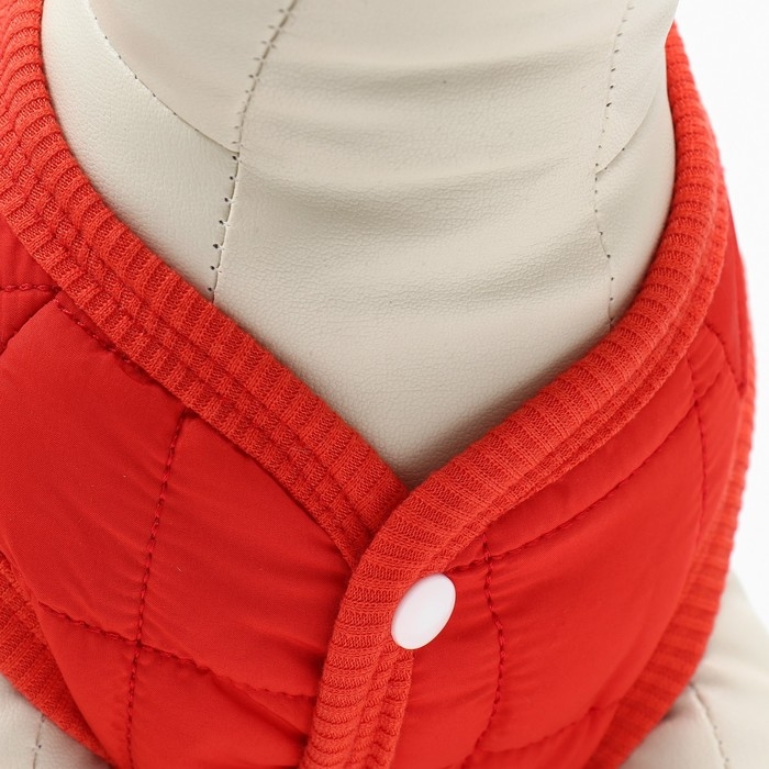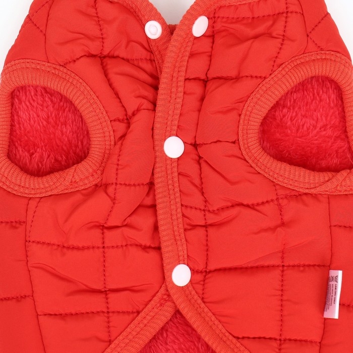 Тёплая, стёганая куртка подойдёт вашему питомцу в холодную погоду!Куртка с открытым животом пойдет, как для мальчиков, так и для девочек. Не сковывает движений, надежно защищает от грязи, дождя и ветра.Представлена в ярко красной расцветке. Куртка застегивается кнопками на животе, что позволяет легко надевать и снимать. Внутри имеется тёплый подклад.На спине куртки имеется кольцо для поводка, что облегчит подготовку к прогулкам.Позаботьтесь о своем любимце - это куртка обеспечит вашего любимца комфортом и теплом в плохую погоду.