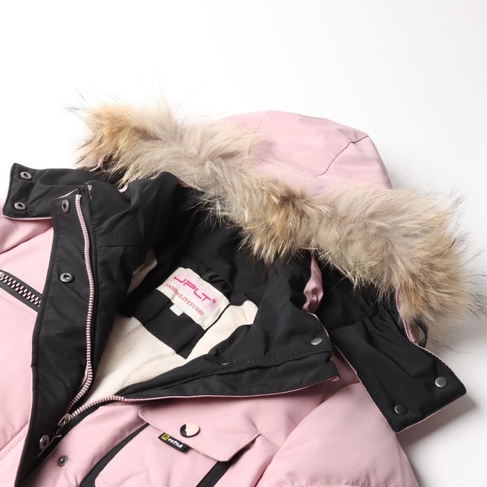 - Съёмный капюшон со шнурком, застёжкой на кнопках и меховой опушкой из натурального меха енота.