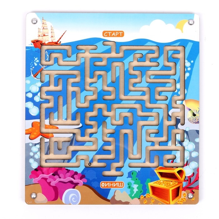 Лабиринт с шариком «Океан» представляет собой деревянную панель с различными «ходами» и шариком. Задача ребенка — провести шарик от начала до конца, используя навыки планирования и сосредоточенности.