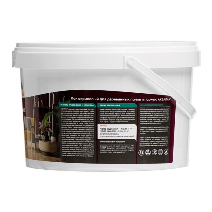 Лак защитно-декоративный для деревянных полов и паркета «АКВАЛАК» применяется внутри зданий для паркетных и дощатых полов, лестниц, перил, а также других деревянных поверхностей, подвергающихся сильному износу