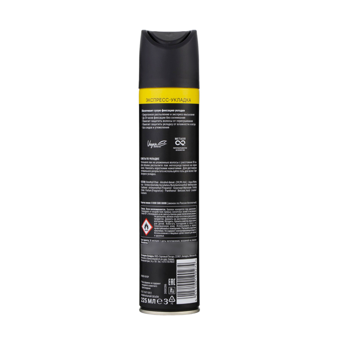 Состав: Dimethyl Ether, Alcohol denat. (32,2 %), Aqua, Octylacrylamide/Acrylates/Butylaminoethyl Methacrylate Copolymer, Aminomethyl Propanol, Vinyl Caprolactam/VP/Dimethylaminoethyl Methacrylate Copolymer, Parfum, Niacinamide, Panthenol, Limonene, Linalool, Citronellol, Benzyl Alcohol, Alpha-Isomethyl Ionone.