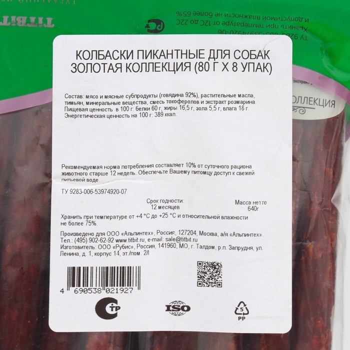 Лакомство TitBit Золотая коллекция для собак "Колбаски Пикантные" 80 г х 8 упак