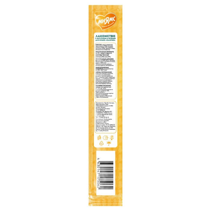Лакомые палочки для кошек с цыпленком и печенью «Мнямс» – вкусное и здоровое угощение, от которого не откажется даже самая привередливая и избалованная кошка. Каждая палочка индивидуально упакована, что позволяет сохранить запах и вкусовые качества надолго. Без искусственных ароматизаторов и красителей.