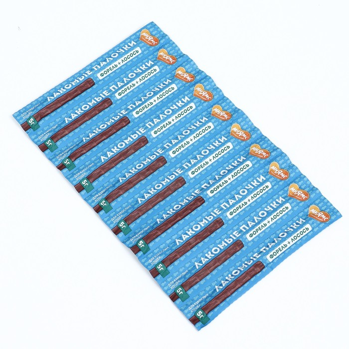 Лакомые палочки для кошек с лососем и форелью станут любимым угощением для вашего питомца. Кроме того что каждая палочка содержит высококачественные морепродукты, в ее состав также входят и продукты растительного происхождения, которые гарантировано подарят кошке здоровый вид. Ингредиенты: мясо и производные животного происхождения, рыба и ее производные (из них 8% лосось, 8% форель), дрожжи, сахар, минералы.