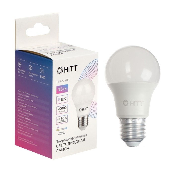 Лампа HiTT-PL, A60, 15 Вт, 230 В, E27, 3000 К