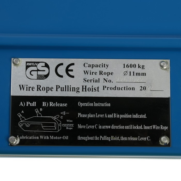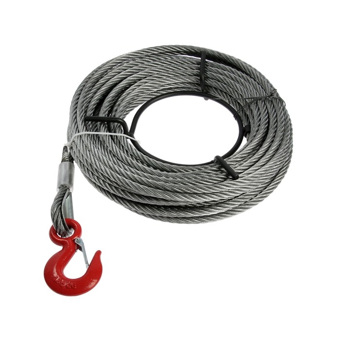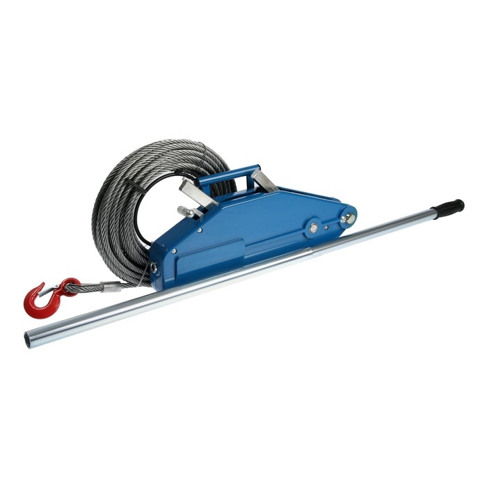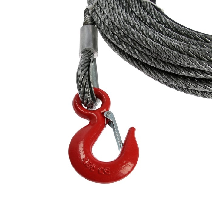 Инструмент с толстым металлическим тросом имеет диаметр 11 мм, длину — 20 м. Тяговое усилие составляет 1 600 кг, что позволяет поднимать груз весом до 2 т.