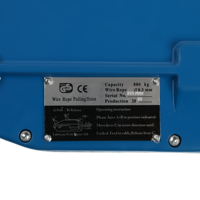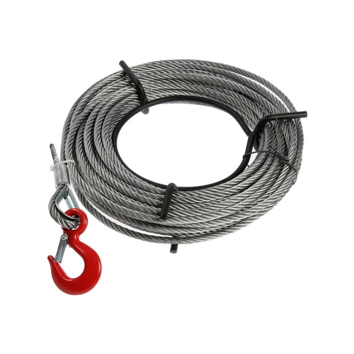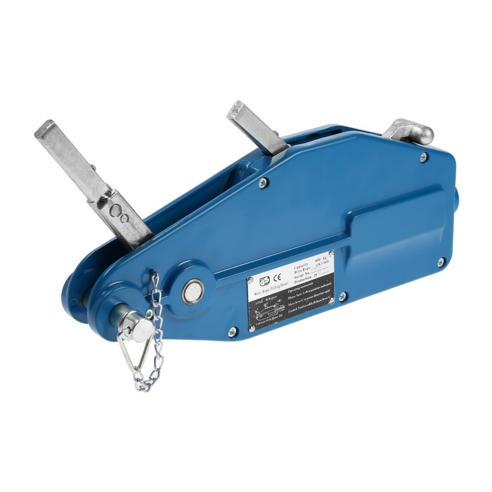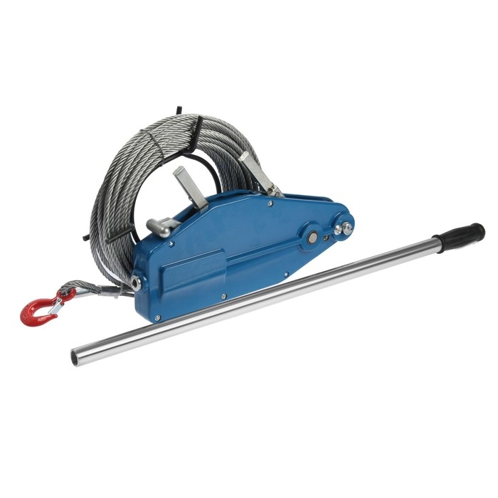 Инструмент с толстым металлическим тросом имеет диаметр 8,3 мм, длину — 20 м. Тяговое усилие составляет 800 кг, что позволяет поднимать груз весом до 1 т.