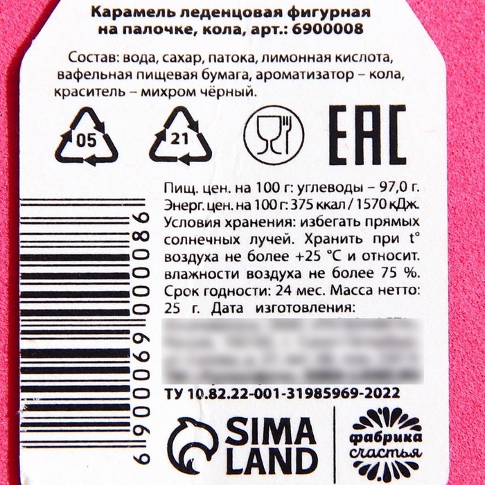 Состав: вода, сахар, патока, лимонная кислота, вафельная пищевая бумага, ароматизатор – кола, краситель - михром чёрный.