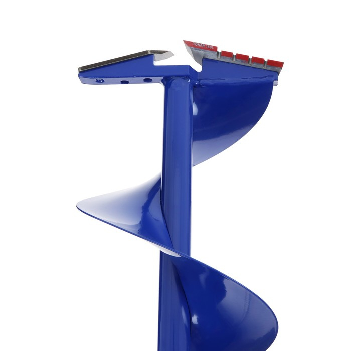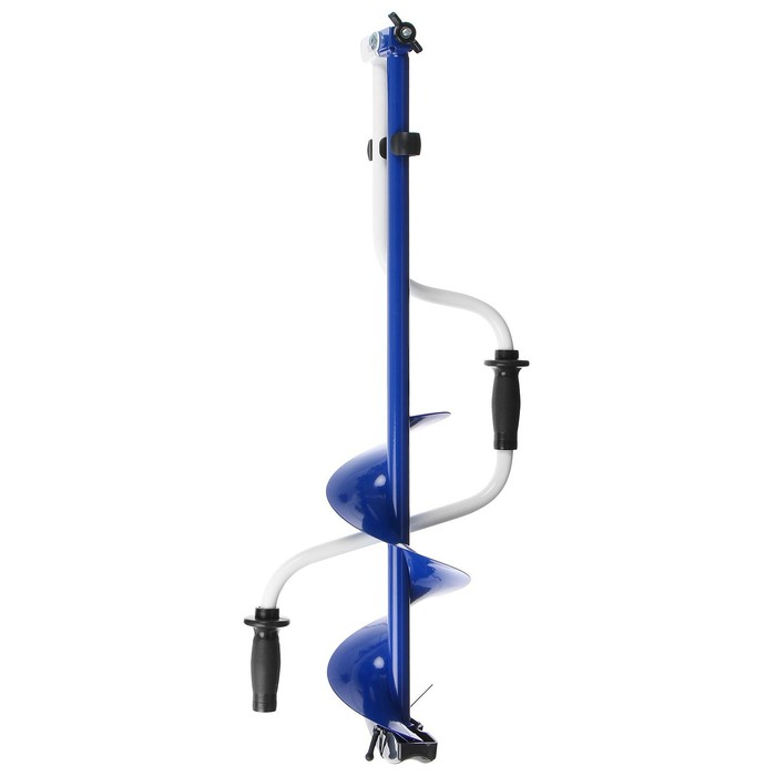 Верхняя рукоятка ледобура смещена относительно оси шнека на 130 мм, а нижняя на 150 мм. Такое расположение рукояток позволяет вращать ледобур одновременно двумя руками, тем самым, не прикладывая особых усилий, увеличивая скорость бурения лунок во льду.