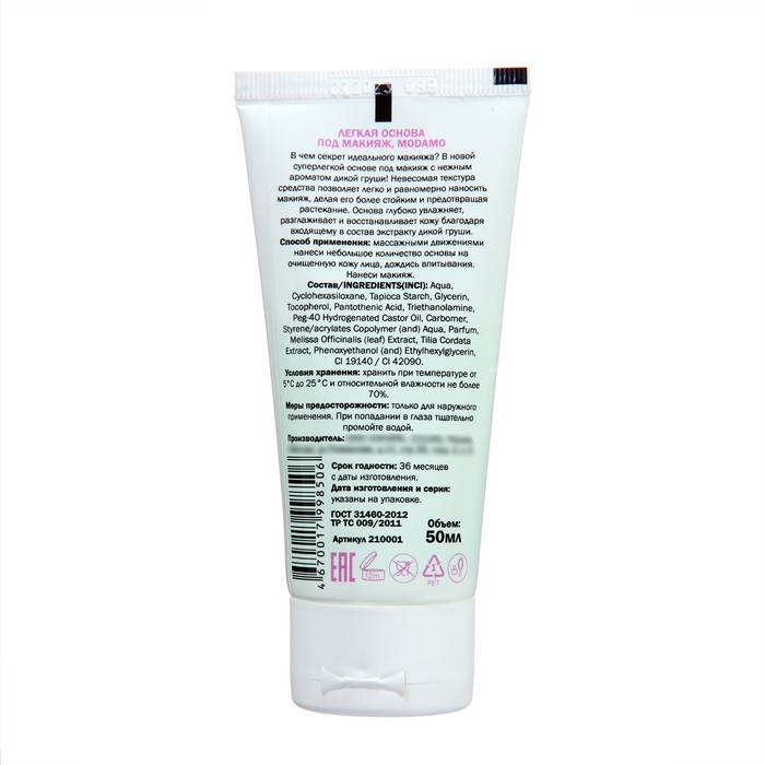Основа под макияж "moDAmo" подходит для любого типа кожи, включая чувствительную. Она не вызывает раздражений и аллергических реакций, позволяя коже дышать. Средство представлено в объеме 50 мл.
