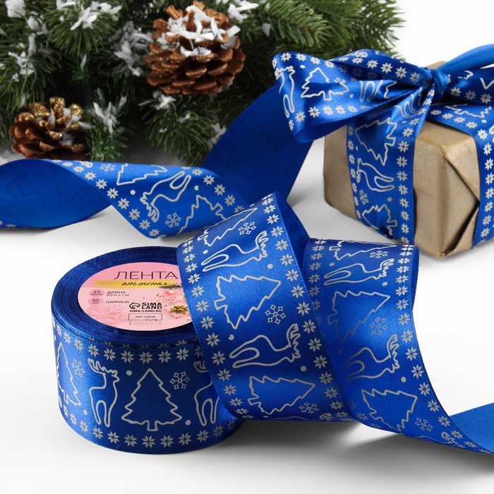 Лента атласная «Олени», 50 мм, 23 ± 1 м, цвет синий №122