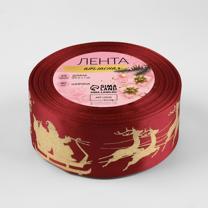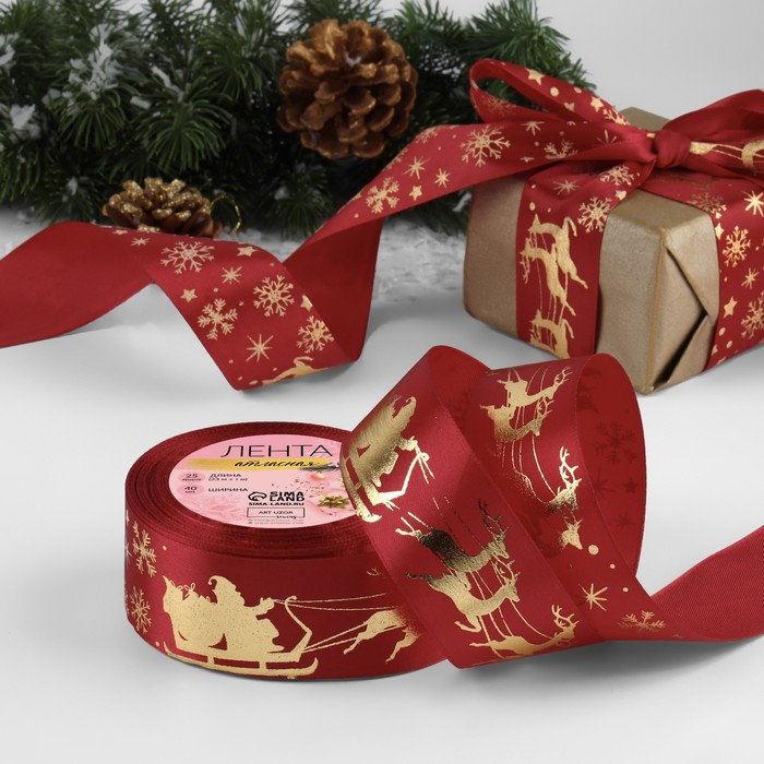 Лента атласная с тиснением «Олени в упряжке», 40 мм, 23 ± 1 м, цвет красный/золотой №33