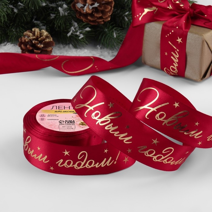 Лента атласная с тиснением «С Новым годом!», 40 мм, 23 ± 1 м, цвет красный/золотой №033