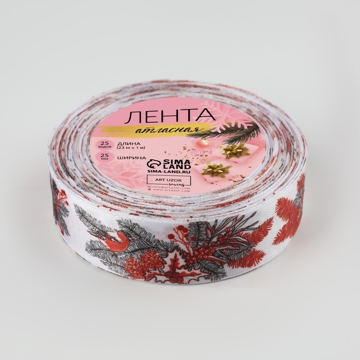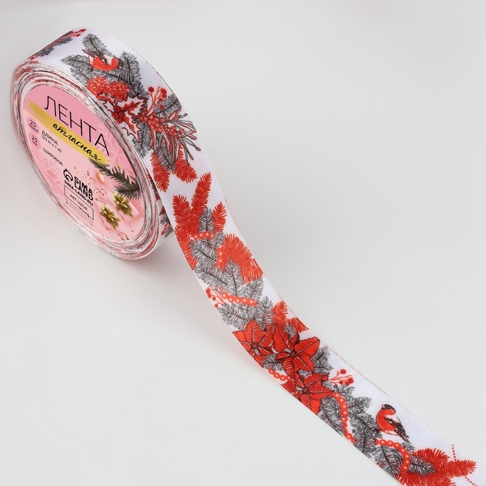 Лента атласная «Снегири», 25 мм, 23 ± 1 м