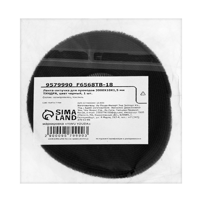 Лента-липучка для проводов 3000Х10Х1,5 мм ТУНДРА, цвет черный, 1 шт.